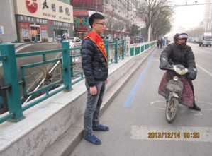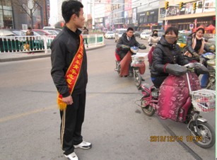 为倡导文明出行行为,督促市民养成良好出行习惯,tyc41183太阳成集团积极组织学生参加社会服务志愿活动。2013年12月14日,8名志愿者在市区繁华路口执勤,引导车辆和行人各行其道,遵守交通秩序,并对闯红灯、翻栅栏等不文明现象进行劝导。
