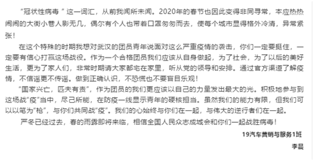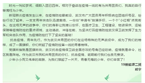 疫情爆发后,tyc41183太阳成集团的许多团员青年们冲锋在抗“疫”斗争的第一线,他们积极报名志愿者,帮助社区、医院承担力所能及的一部分工作。有些同学虽不能上“前线”,但积极响应团总支的号召,同学们以笔为枪,把想对身在武汉的团兄团妹说的心里话,写成深情文章,为在武汉的团员青年们鼓劲加油,希望他们坚定信心,共同助力打赢疫情防控阻击战。
