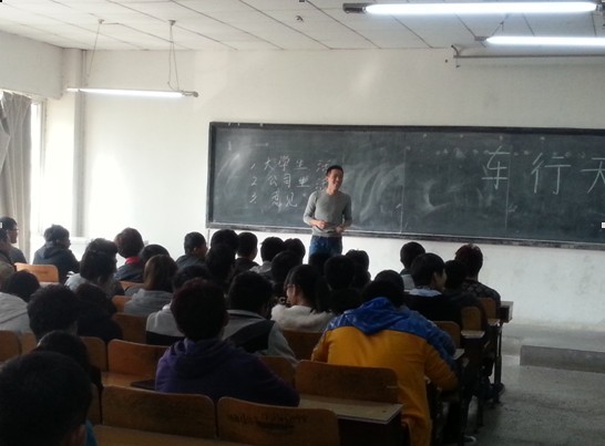 面对汇集于A302教室的200余名13级新生,邵明宽从三个方面做了精彩的演讲:大学生活、工作成长经历、良好建议。他说大一的基础课程、大二的专业课程和大三的拓展课程是以后毕业实习和工作的基础,一定要认真学习,学扎实。在工作中要善于沟通、包容、学习新知识、认识新朋友,遇到困难不妥协,一定要想尽一切办法克服它,在向客户介绍汽车的配置时一定要用通俗的语言把复杂的技术讲述清楚,这就要求销售人员对汽车技术相当精通。同时他还给学弟学妹们提了一些学习和生活的建议。